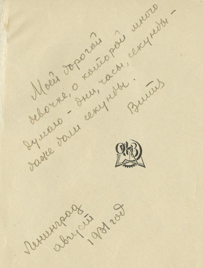 Кроме истории с духами «Coty», включившей имена Лили, Эльзы, Примакова, следует история о книгах. Раньше дарили книги и их подписывали. По разным поводам Витя дарил Оле книги и как разнообразно и нежно он их подписывал. Т.к. после его ареста мама боялась обыска, то сохранились только первые листы с посвящениями. Их она брала в эвакуацию вместе с двумя чемоданчиками писем. Их сохраняю и я. А самая любимая мамина книга «Декамерон», издательства «Академия», так и стоит на книжной полке.