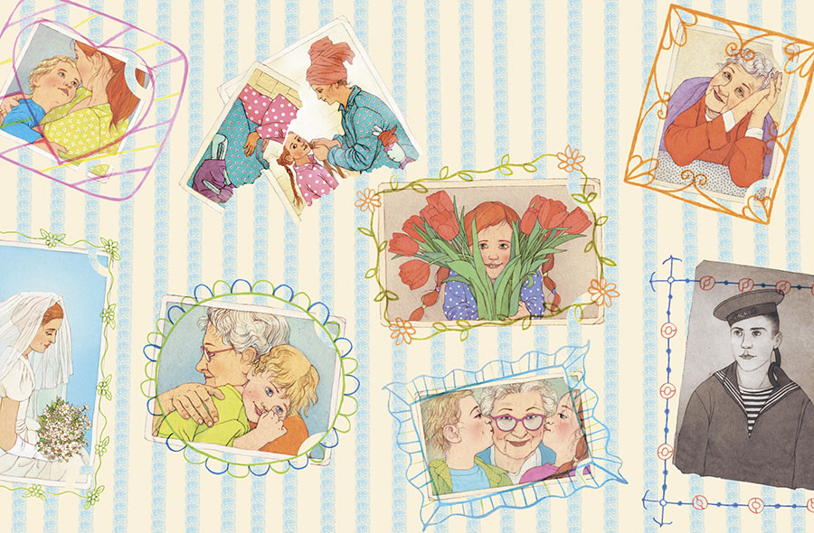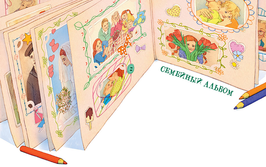 Это наш семейный альбом. Мы сами его собирали. Папа разрезал и склеил страницы. Мама обвязала обложку голубой пряжей. Я пришила пуговицы для застёжки, а мой младший брат Кит разрисовал листы. У него неплохо получилось, и все его похвалили.