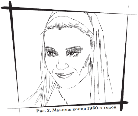 В конце 60-х годов XX века акцент делали на глазах, а губы порой – неестественно бледными (рис. 2). Яркий пример – известная фотомодель Твигги, которая стала символом того времени. Черная тушь наносилась в несколько слоев для создания эффекта бархатных ресниц. В то время стали популярными накладные ресницы, которые приклеивались к верхнему веку. Нижние ресницы зачастую рисовались тонкой кисточкой и тушью прямо на коже. Чтобы сделать акцент на преувеличенно больших глазах, губы красили в бледные пастельные тона.