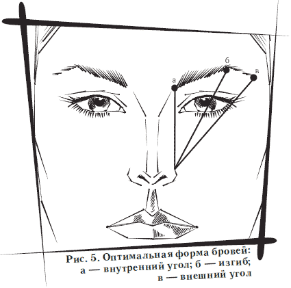 Брови должны быть аккуратными и оформленными. Их натуральные длина и ширина не всегда придают лицу красоту, однако менять эти данные следует с осторожностью. Прежде чем менять форму бровей, запомните правило стилистов: внутренний угол должен быть на одной вертикали с внутренним углом глаза, а внешний должен быть не ниже внутреннего (в противном случае получите «взгляд Пьеро») (рис. 5).