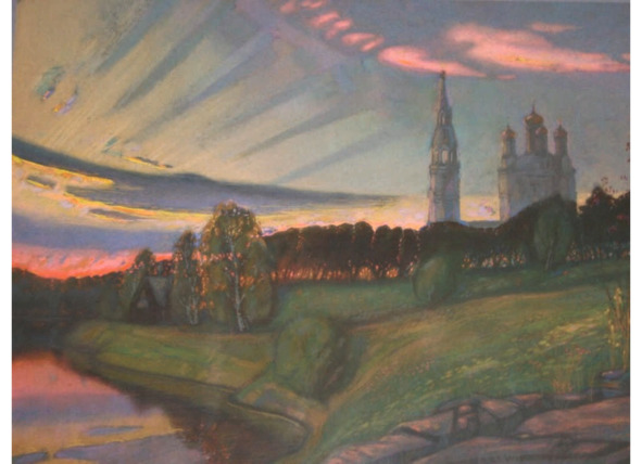 Пламенеющие алые всполохи четким силуэтом выделяют череду деревьев и Троицкий собор Верхотурского Кремля. Летящие лучи заката, как отблески взмахов парящей птицы, оставляют розовые и жёлтые следы оперенья, перекликаются друг с другом и контрастируют с фиолетовой землей, создавая впечатление звенящего колокольного звона, разносящегося в пространстве заката. Эмоционально и выразительно передано цветовое решение картины. Большую роль в этом восприятии играет технологический процесс – использование тёмно-серого цвета бумаги и подкладочных слоёв. Контурная линия волной проходит через композиционный центр картины, повторяя силуэт собора. Чётко обозначены и выполнены все узнаваемые архитектурные детали собора, деревья, камни. Передний план выделен посредством контраста светлой травы на тёмном фоне, а дальний план – тёмным силуэтом на ярком алом небе. Закат солнца – одно из красивейших явлений природы, позволяющее прикоснуться к её величию и первозданной красоте – Божественному чуду, подобному гениальному творению Художника!