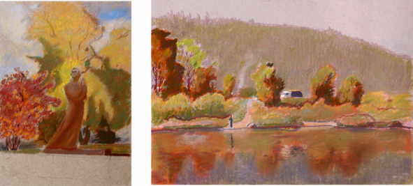 2). «Летний пейзаж с озером и машиной». Бумага, пастель.