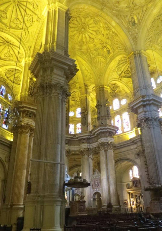 Видимо, такими же высоченными деревьями любовались когда-то создатели Кафедрального собора Малаги, потому что, когда они вошли туда, то оказались в такой же красивой аллее, только возведённой из камня. Стройные колонны-стволы образовывали геометрически чёткие прямые аллеи и уходили под небеса, где их кроны соединялись в причудливые цветочные и фигурные орнаменты, образуя купола.