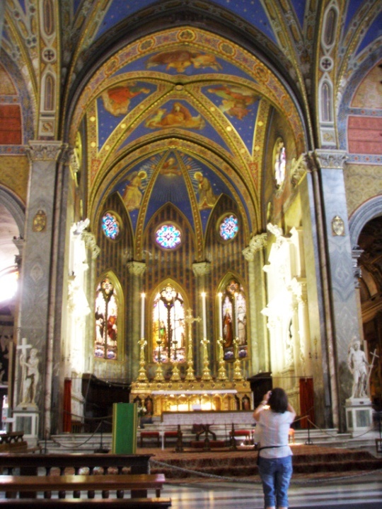 Её поразило многоцветье внутреннего интерьера неприметной на огромной белой площади церкви Санта-Мария-дель-Попполо, где она без труда нашла две фрески Караваджо, выделяющиеся среди остальных великолепных картин своей цветовой гаммой (доминирование охры и зелени) и естественностью изображения библейских сюжетов.