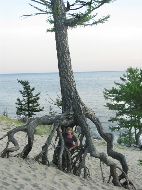 «Погода наишикарнейшая – тепло, солнце, на небе ни облачка. И если бы не вода в Байкале +15 градусов, то вполне можно ощутить себя где-нибудь на морском курорте. Мы так, конечно, заходить – заходили, умыться там, ручки-ножки пополоскать, а вот мальчишки-проводники плавали и ныряли со скал от души, и очень радовались, что вода в Байкале в этом году такая теплая. Я, сославшись на ногу, валялась на песочке, а Сашка с Антохой пошли лазать по скалам, а потом прибежали за мной и утащили фоткаться в «ходульных» деревьях и пробовать местную кулебяку с омулем»