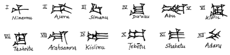 Задание 2. Названия двенадцати месяцев (Нисану, Айару, Симану, Ду’узу, Абу, Улулу, Ташриту, Арахсамна, Кислиму, Тебету, Шабату, Адару):