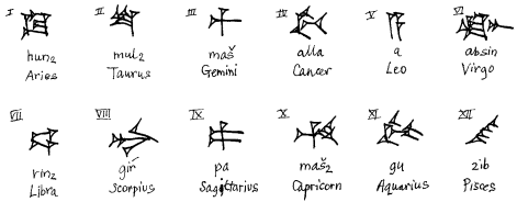 Вавилонская Система Б представляет собой астрономическую таблицу (обычно называемую эфемеридами), показывающую движение Луны между знаками Зодиака; на приведенной фотографии воспроизведена часть этой таблицы для 104–102 гг. до Р. Х. Даже начинающий ассириолог сразу обнаружит, что таблица содержит только столбцы чисел, записанные клинописьюз. Числа от 1 до 60 записываются в клинописной системе настолько просто, что им может научиться любой ребенок; ну а уж образованному и умеющему считать греку для усвоения всей системы понадобилось бы примерно четыре минуты. Но вот что замечательно: для чтения и этой, и многих других астрономических таблиц, собранных в классическом труде Поздневавилонские астрономические таблицы, для понимания их смысла и для перевода их на греческий – для всего этого надо лишь освоить следующие группы знаков: