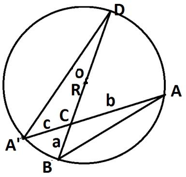 Как известно, по теореме о произведении отрезков хорд, пересекающиеся хорда и диаметр образуют подобные треугольники, поэтому треугольники CA’D и ACB подобны. Отсюда bc = (2R –a)a .