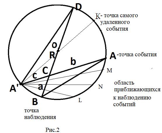 Пусть точка В – точка наблюдения за событием Вселенной, которое происходит в точке А. С позиции этой точки В радиус Вселенной есть допустим конечная величина R.
