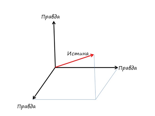 В руках моего собеседника появился блокнот средних размеров и авторучка, стилизованная под гусиное перо. Он открыл блокнот и принялся рисовать. Изобразив объемную фигуру, он сделал на ней надпись «Истина». Рядом три вектора, исходящие из одной точки, складывались в один большой. Отложив перо в сторону, продолжил.