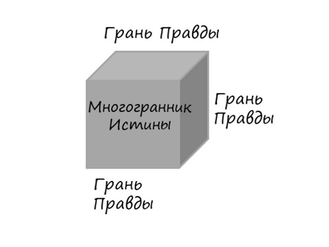 – Истина похожа на объемную многомерную геометрическую фигуру с множеством граней. Каждый человек смотрит на личную грань. Особо одарённые видят несколько. И ни один не видит всей фигуры. Грань истины – это правда отдельного человека. Каждый думает, что его грань правильная и только он прав. Так и есть. Каждый прав. Мнение каждого является частью одного целого. Кому-то истина видится двухмерным объектом. Например, кругом или прямоугольником. На самом деле, это может быть трехмерный многогранник. Будем считать, что единая истина существует. В отличие от теории туннелей реальности, убеждающей, что истины нет. В любом случае, любые взгляды на вещи верны. Точек отсчёта не меньше, чем частиц во вселенной. Не говоря о других невидимых измерениях. Истину можно представить в многомерной системе координат, как сумму векторов. Ни одно знание не может быть истинным само по себе. Оценивая явление, мы отдаляемся от истины.