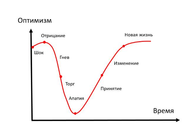 – По теме кривой переживания много сказано. Я хотел бы отметить главное. Каждый человек, сталкиваясь с проблемой, не хочет принимать произошедшее. Он говорит: «Нет, этого не бывает, это случилось не со мной. За что?» Испытывает гнев и начинает пытаться уговорить себя или других: «Может быть можно что-нибудь сделать? Может не все так страшно?» Понимая, что всё напрасно, впадает в апатию, теряя оптимизм.
