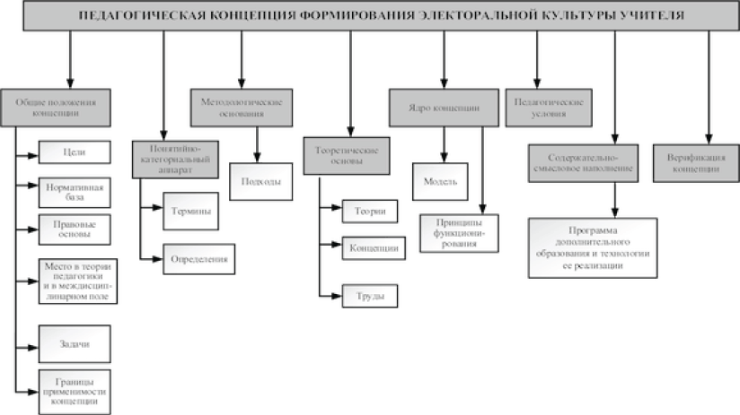 Логика построения педагогической концепции. Главным результатом данного исследования, по замыслу автора, должна стать концепция формирования электоральной культуры учителя, реализация которой будет способствовать укреплению веры граждан страны в реальную возможность сознательного влияния на свое будущее и, как следствие, в глобальном плане способность изменить ситуацию с электоральной активностью граждан. Нам представляется, что начинать эту работу следует с учителей, поскольку именно они больше других взаимодействуют с молодежью. В связи с этим прежде всего мы обратились к проблеме структуры разрабатываемой педагогической концепции в современных условиях и ее содержательного наполнения, а также процессуального и технологического решения. Мы считаем необходимым отразить в самом начале логику, по которой мы будем выстраивать предлагаемую нами педагогическую концепцию.