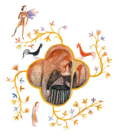– Ладно, помогу тебе и так, потому что полюбил я тебя на всю жизнь. Возьми эту бутылочку оливкового масла, ломоть хлеба, верёвку и метлу. Как придёшь к воротам дома, смажь ржавые петли этим маслицем. Хлеб брось сторожевому псу. А женщине, которая тянет из колодца ведро с водой, привязав к нему свои косы, дай верёвку. В кухне увидишь несчастную женщину, которая языком вылизывает золу из печи. Ей отдай метлу. Шкатулку найдёшь на шкафу. Хватай её и уноси ноги из дому. Сделаешь, как я сказал, останешься живой.