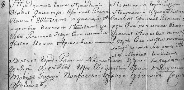 Пока мы не ушли далеко от венчания Дмитрия Ефимовича Ряжского, очень коротко скажу о той, кто стала его женой до конца жизни и родила – по моим подсчетам – девятерых детей. Авдотья (Евдокия) Ивановна Мостьинская, как уже было сказано выше, была дочкой дьячка из расположенного неподалеку от Ряжска села Мостье Ивана Артемьева. Поручителями (по-современному – свидетелями) при венчании были «по женихе города Ряжска Покровской церкви дьякон Симеон Ефимов, Ряжской округи села Поплевина дьячок Герасим Алексеев, по невесте Ряжской округи села Мостья пономарь Лазарь Иванов Мещанин Алексей Леонтьев Гнитчин». Посторонних людей в те годы ни в поручители, ни в восприемники (крестные) точно не звали, поэтому можно сделать уверенное предположение: среди них были родственники как жениха, так и невесты. Например, упомянутые Симеон Ефимов мог быть братом Дмитрия Ефимовича Ряжского, а Лазарь Иванов – братом Евдокии Ивановны (впрочем, документальных подтверждений этому у меня нет. Надеюсь, только пока нет). Забегая вперед, скажу, что похоронена Евдокия Ивановна под тем же камнем, что и ее муж, вместе с двумя дочерями и внучкой…