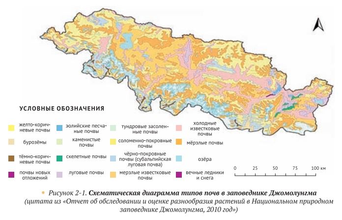 Распределение почв в этом районе территориально ограничено Гималайскими горами, и разница между севером и югом чрезвычайна (рис. 2-1). Зона лесных почв на южном участке аналогична зоне лесных почв на юго-востоке Тибетского плато и относится к вертикальной структуре субтропической жёлто-коричневой и коричневой почв. Район широкой долины на северном плато- это в основном зона субальпийских пастбищ, окружённая зоной субальпийских высокогорных почв южного Тибетского плато. Так как почвы обнажённых скальных образований неплодородные, в этом районе растительности мало, что является ещё одной причиной необходимости усиления защиты данной местности.Разрушения могут повлечь значительные экологические изменения.
