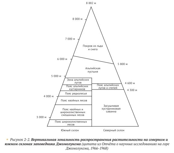 Плато на северном участке природного заповедника Джомолунгма подвергается воздействию холодного фронта, который движется с Северо-Западного Китая, и представлено в основном пустынными степями и лугопастбищными районами. В то время как горные ущелья и каньоны на южном участке находятся в основном под влиянием тёплых течений Индийского океана, и в результате в них развились густые первобытные леса, которые представлены вечнозелёными тропическими лесами, альпийскими хвойными лесам и районами высокогорной растительности. Флора на северном и южном участках, демонстрируя определённые закономерности зональных из – менений (рис. 2-2), оказала значительное влияние на изменения фауны по вертикали.