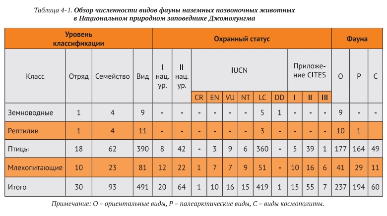 По результатам исследований в природном заповеднике Джомолунгма, полученных за последние 3 года, зарегистрировано в общей сложности 491 вид, 93 семейства, 30 отрядов наземных диких позвоночных животных, что составляет 19,4% из 2527 видов позвоночных в стране и более 3/4 от 655 видов позвоночных Тибетского автономного района (таблица 4-1). Среди них 20 видов находятся под национальной защитой I уровня и 64 вида находятся под национальной защитой II уровня; 15 видов перечислены в Приложении I «Конвенции о международной торговле видами дикой фауны и флоры, находящимися под угрозой исчезновения» (CITES), 55 видов в Приложении II и 7 видов в Приложении III. Многие виды включены в Красную книгу Международного союза охраны природы (МСОП): 9 исчезающих видов (EN), уязвимые (VU)– 17 видов, близкие к уязвимому положению (NT) – 18 видов, наименее опасные (LC) – 411 видов, о которых недостаточно данных (DD)– 1 вид. С точки зрения состава фауны доминирующими являются представители ориентальной области (237 видов), за ними следуют представители палеарктической области (194 вида) и наименее широко распространённые виды (всего 60).