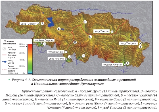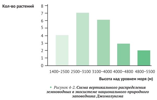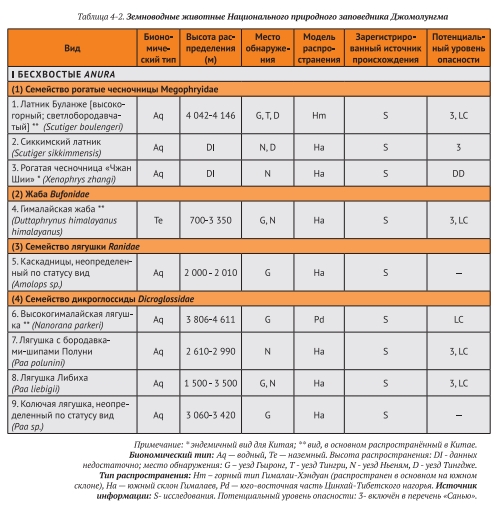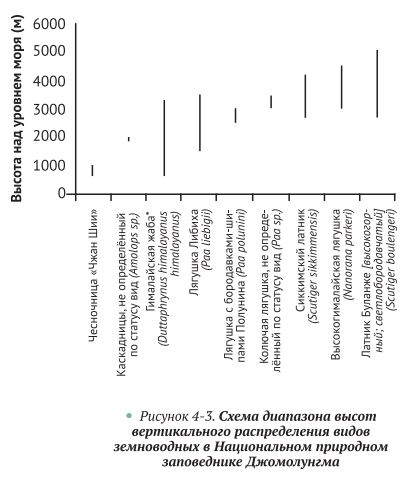 Диапазоны вертикального зонирования и распределения различных видов сильно отличаются. Среди них самый большой вертикальный диапазон составляет около 2650 м у гималайской жабы (Duttaphrynus himalayanus), диапазон распространения тибетской жабы составляет 2400 м и 2000 м у лягушки Либиха (Paa liebigii). Ареал распространения рогатой чесночница «Чжан Шии» (Xenophrys zhangi), неопределённого по статусу вида каскадницы (Amolops sp.) и неопределённой по статусу вида колючей лягушки (Paa sp.) относительно узок: менее 400 м (рис. 4-3).