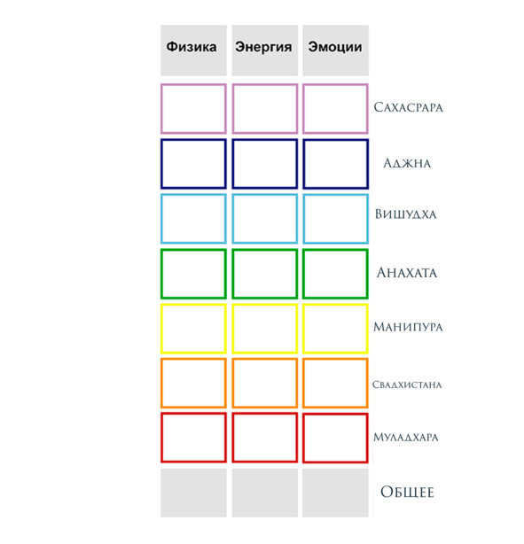 Заполнять таблицу начинаем снизу вверх, начиная с нижней корневой чакры.