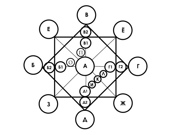 – Теперь нужно рассчитать линии до конца. Первая линия: Б, Б2 и Б1 – ДРК, или детско-родительская карма. Рассчитывать нужно с крайней точки – Б1. Чтобы получить число, нужно суммировать ближайшие известные нам точки, а это Б и А. Б+А=Б1.