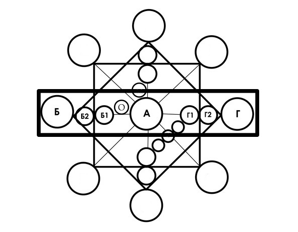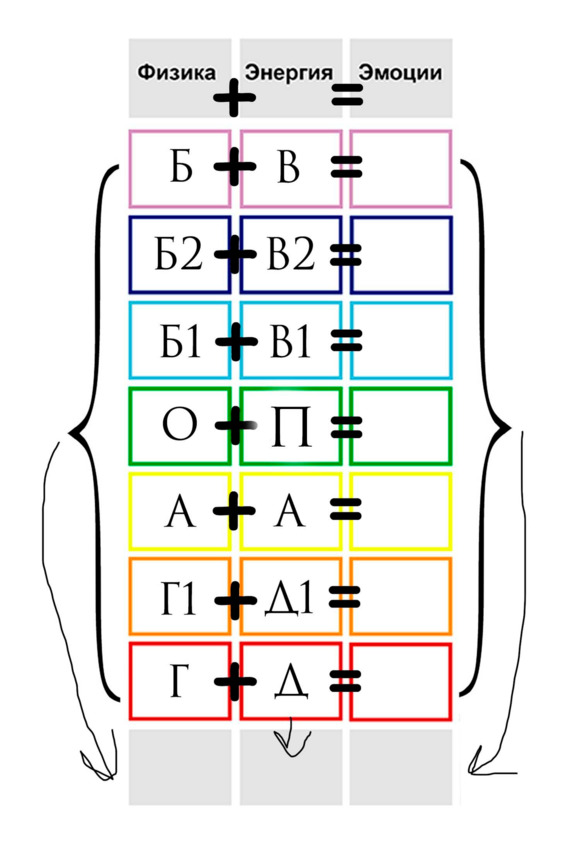 Первый столбец «Физика» заполняется энергиями, которые стоят на линии материи, на схеме это точки Б, Б2, Б1, А, Г1, Г2 и Г.