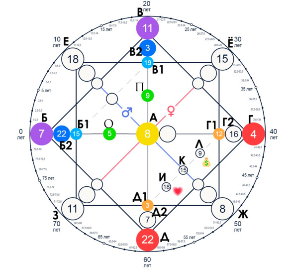 – Чтобы получить число на точке Г, нам нужно сложить цифры в числе года рождения. Например, год рождения человека 1993. Значит 1+9+9+3=22. Если бы число вышло 23 и выше, мы бы суммировали его.