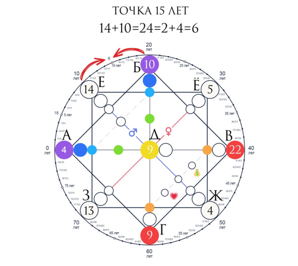 10 лет (точка Е) +20 лет (точка Б) = 15 лет т.е. 14+10=24=2+4=6