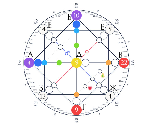 Например, мы возьмём 10тие на котором стоит 22 энергия. Значит в ближайший 9летний цикл для нас актуальны события по 22 энергии. Также, 10 лет включают в себя 5летний цикл и 9 циклов по одному году, что в свою очередь добавляют нам как минимум 9 энергий в помощь для понимания ситуации. Значит в 40 лет у человека наступит 10летний цикл под 22 энергией и в первый год как раз будут формироваться события под неё.