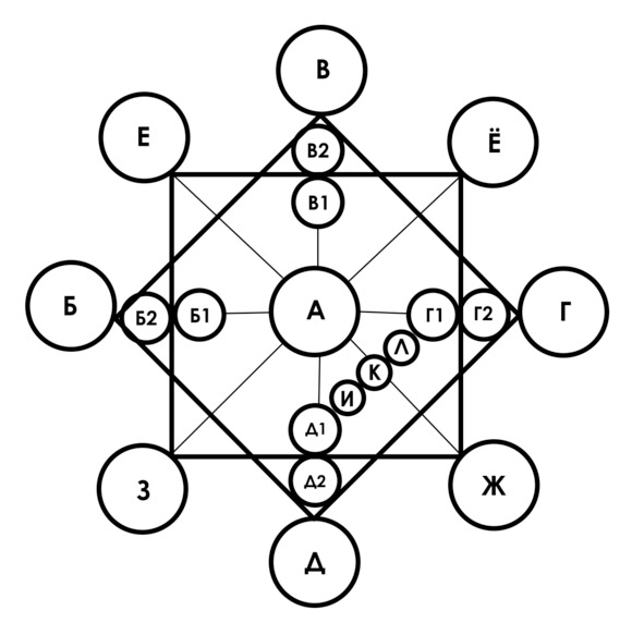 – Третья линия – это материальная карма: Г, Г2 и Г1. Чтобы получить число на точке Г1, нужно суммировать ближайшие известные нам точки, а это Г и А. Г+А=Г1.