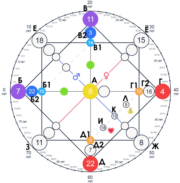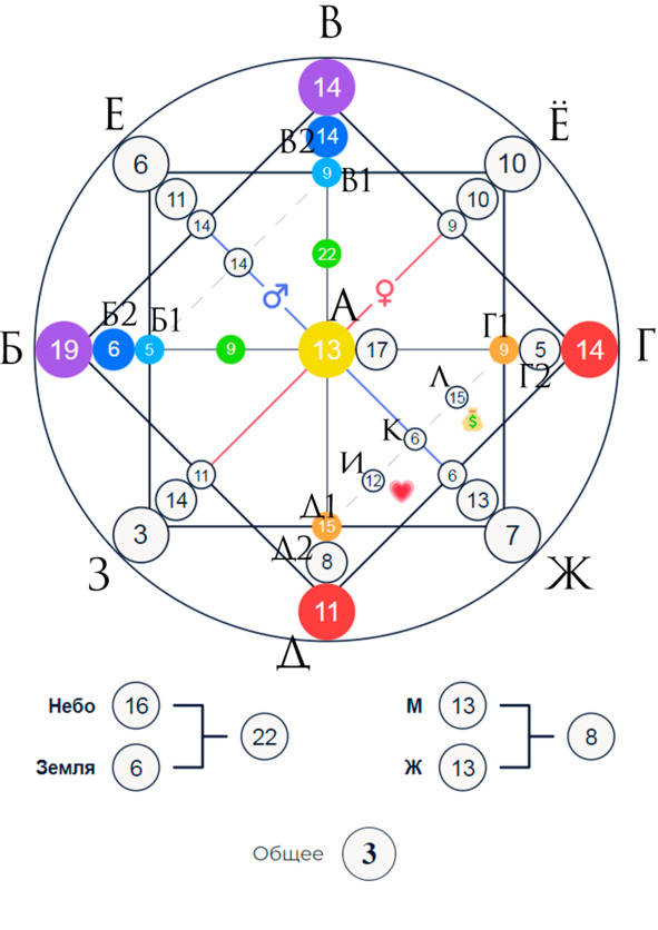 – Чтобы получить число на точке Г, нам нужно сложить цифры в числе года рождения. Например, год рождения человека 1993. Значит, 1+9+9+3=22. Если бы число вышло 23 и выше, мы бы суммировали его.