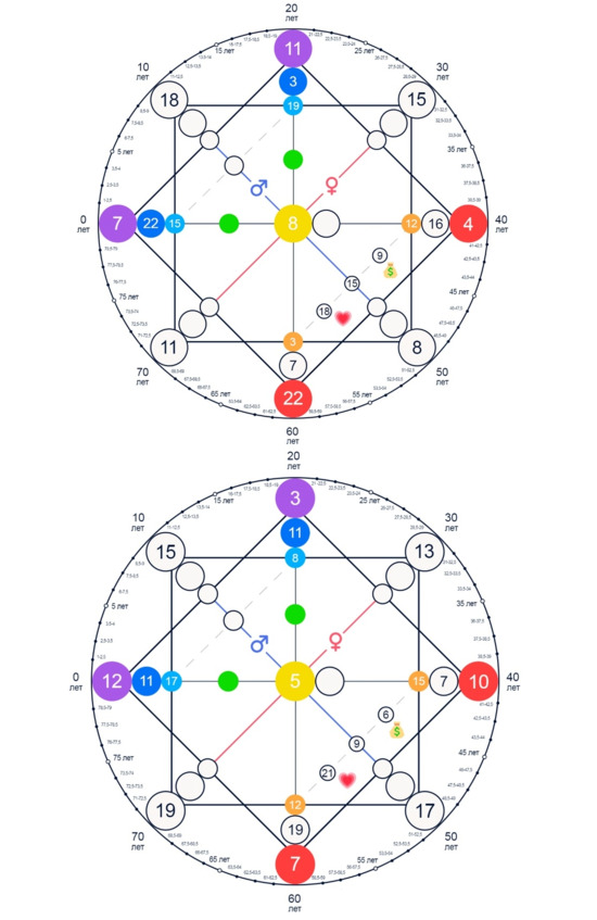 Например, таланты мы смотрим не только по линии таланта, но и по линии денег, материальной карты, центр и точка внешнего проявления. Точно так же, как и самореализацию, отношения и др.