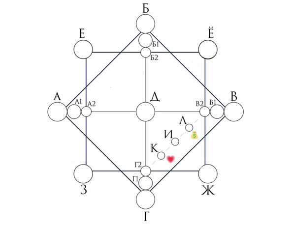 Она находится в верхней правой части Матрицы. На рисунках это линия – 8-5-15, т. е. Ё-ё1-ё2.