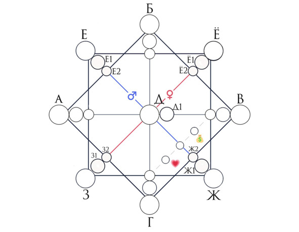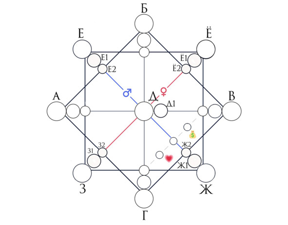 А вот после этого наступает интересный момент, т.к. перед тем, как просчитывать линии, нам нужно рассчитать центр родового квадрата – точку Д1. Данная точка называется сила рода. Именно через эту точку делается расчет родовых линий, а не через наш центр.