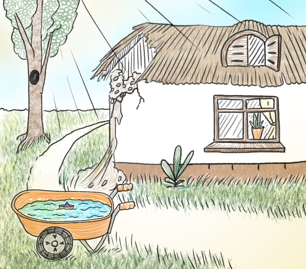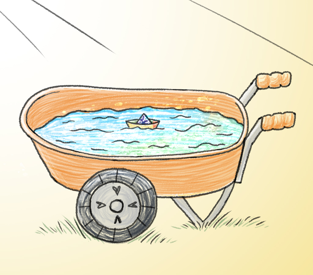 Рысёнок вышел во двор. После дождя всё на улице было намокшее – и молодая трава, и деревья, и забор с калиткой. Рядом со скамейкой он увидел свою тележку. Она была похожа на детскую ванночку, к которой приделали два больших колеса и удобные ручки. Тележка была до краёв наполнена дождевой водой. Настоящий океан для маленького кораблика!