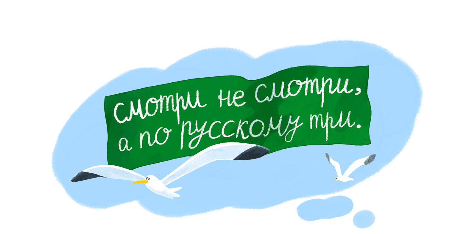 Ему приснился огромный зелёный транспарант с большущими белыми буквами. Он висел над школой, подрагивая на ветру, а Петя смотрел на надпись и думал, какая же всё-таки она смешная и оригинальная. Надпись гласила: «Смотри не смотри, а по русскому три».