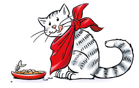 Конни несётся вниз по лестнице. Мяфа нет в его домике – он сидит на кухне и ест. И на нём косынка Конни! Она для него слишком большая, и кончик опустился в миску с рыбным кормом. Фу-у!