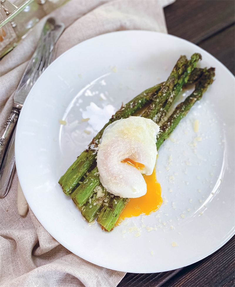 Через 3 минуты осторожно достать яйцо шумовкой и выложить на тарелку со спаржей. Посыпать тертым пармезаном.