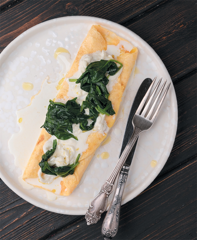 4. Положить в центр омлета хумус. Силиконовой лопаткой завернуть край к середине.