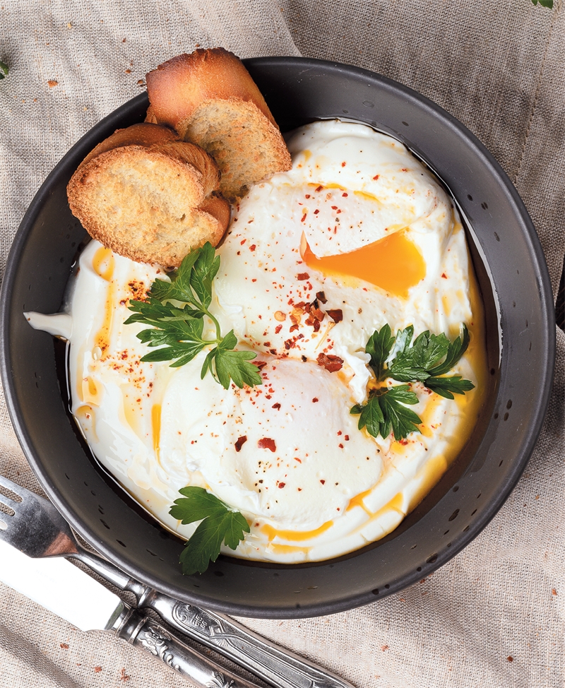 4. Яйцо разбить в ситечко. Дать стечь лишней жидкости. Переложить в небольшую пиалу. В сотейнике довести до кипения 1 л воды, добавить 1 столовую ложку уксуса и 1 чайную ложку соли. Аккуратно положить яйцо. Выключить огонь. Через 3 минуты аккуратно достать яйцо шумовкой и выложить на йогурт.