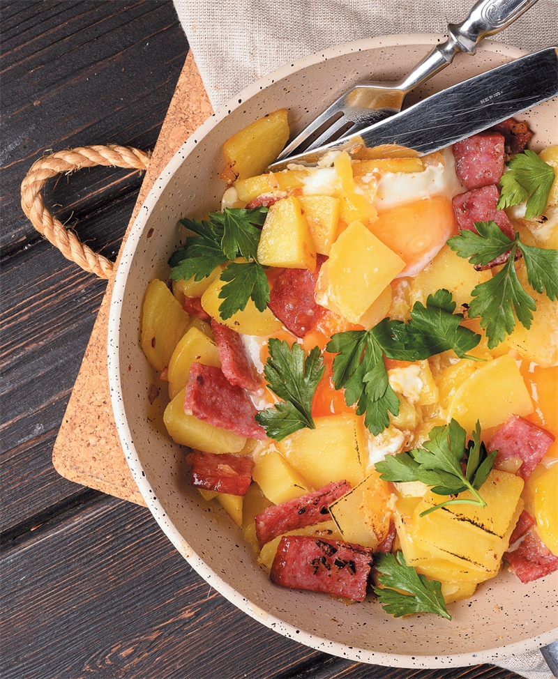 Яичница с колбасой и картофелем