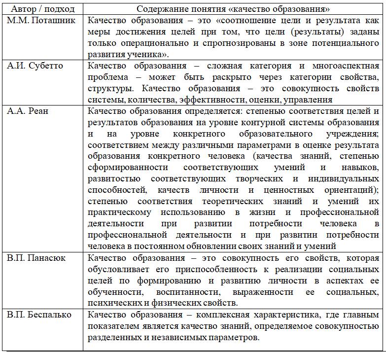 Таблица 1. Основные подходы к определению понятия «качество образования»