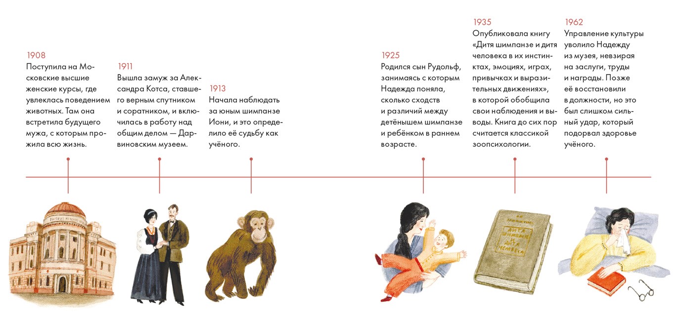 Если ты бывал в Дарвиновском музее в Москве, то мог обратить внимание на портреты красивой женщины с волнистыми волосами. Это Надежда Ладыгина-Котс – сооснователь музея и выдающийся учёный-зоопсихолог. Она первой в мире стала изучать психику шимпанзе, близкого родственника человека, и около 100 лет назад доказала, что у животных есть зачатки мышления. Её работы и выводы опередили своё время и дали начало нескольким новым наукам, а разработанные Надеждой методики учёные используют до сих пор. Благодаря её исследованиям мы стали лучше понимать не только диких животных и домашних любимцев, но и самих себя.