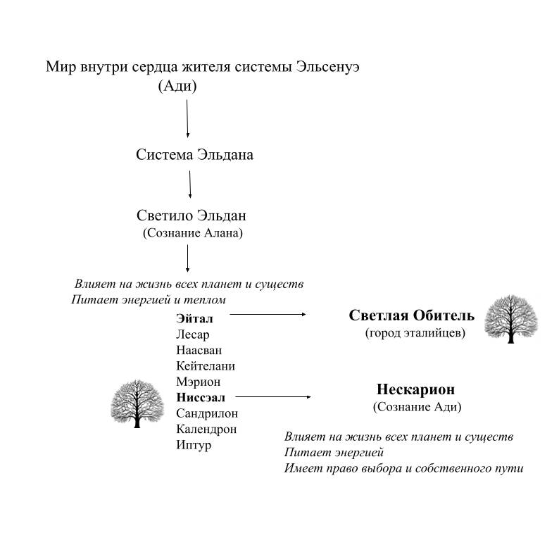 Она началась в тот миг, когда тишину темного пространства нарушил глухой стук крохотного сердца Алана. В его центре вспыхнула яркая звезда с тонкой светящейся оболочкой и белоснежной искоркой внутри – Эльсенуэ́. Она осветила безжизненный вакуум до самых краев звездной системы и испустила из себя два маленьких шара – черный и золотистый. Вторым была я, и, сделав несколько витков вокруг светила, шар с моей душой подлетел к прозрачной, как мыльный пузырь, планете.