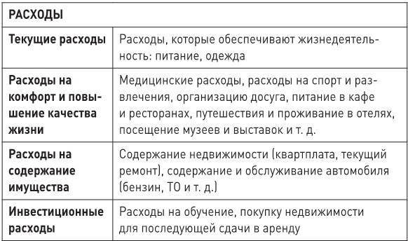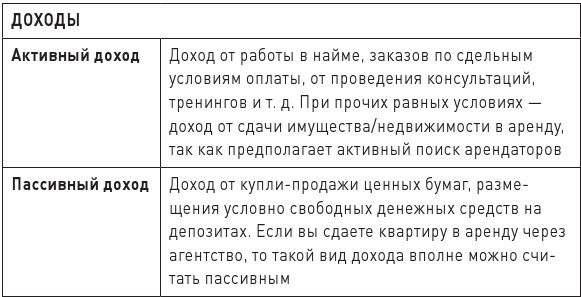 Теперь посмотрим на структуру доходов и расходов (табл. 1.1). Обычно выделяют две формы доходов: активный – доход, который возможен только при условии вашего прямого участия; и пассивный – доход, который не требует вашего прямого участия в его формировании.