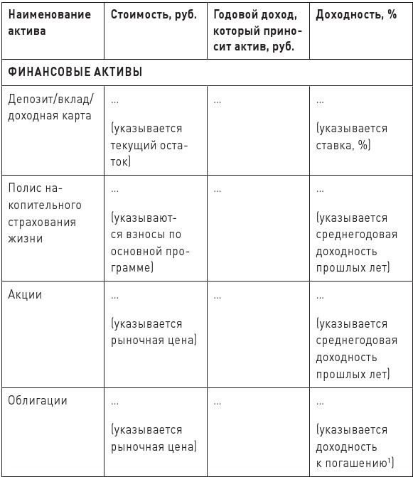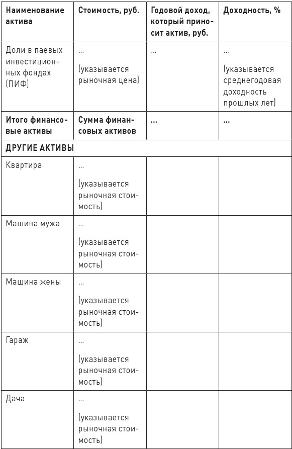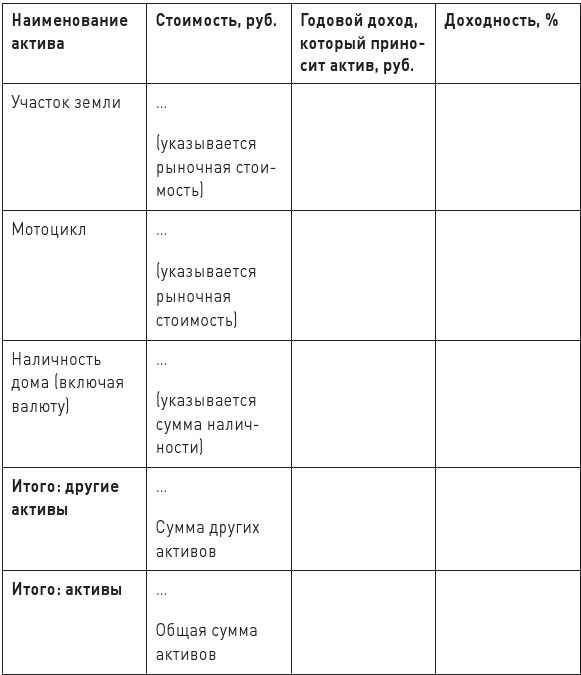 Обратите внимание, что во второй части таблицы (другие активы) последние два столбца – «Годовой доход» и «Доходность» – не заполняются, если активы находятся в личном пользовании. Если какой-то актив сдается в аренду, то указывается годовой доход от сдачи в аренду.