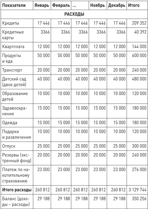 Понимая, какая сумма доходов доступна, можно смело планировать расходную часть, учитывая текущие расходы (питание, ЖКХ), инвестиционные и т. д. Пример финансового плана представлен в табл. 1.6. Обратите внимание: приведены данные по кредитной нагрузке, отпуску, а также обучению детей (через 10 лет).