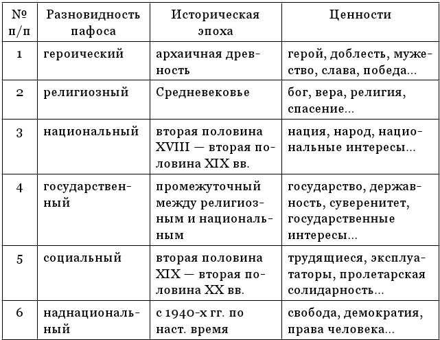 Примерное содержание концептуальных полей и соотнесенность пафосов общественной речи с определенной исторической эпохой представлены в табл. 1.1.