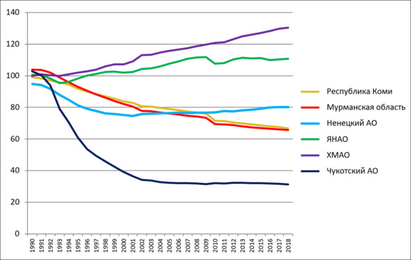 Результаты анализа динамики численности населения за период с 1989 г. по 2018 г. представлены на рис. 21. График иллюстрирует снижение численности населения Ненецкого автономного округа с 1990 г. до 1998 г., а с 1998 г. темпы роста численности населения практически неизменны, что делает регион уникальным на фоне других арктических территорий. Так, в ЯНАО и ХМАО наблюдаются высокие темпы роста населения: с 1990 г. показатель численности населения не снижался. Противоположная ситуация наблюдается в Республике Коми и Мурманской области: с базисного периода наблюдается стабильное снижение данного показателя, в Чукотском автономном округе – экстремальное снижение (численность населения Чукотки снизилась практически в три раза).