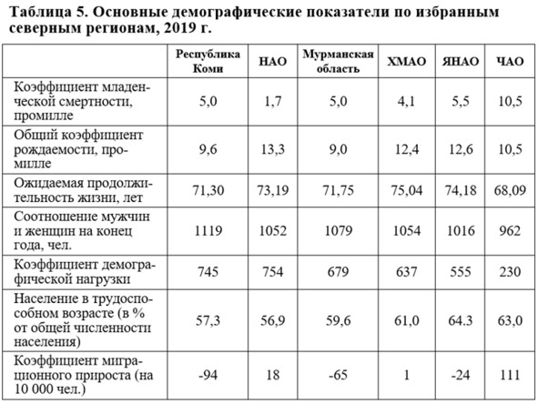 НАО демонстрирует один из самых высоких показателей общего коэффициента рождаемости по всей России (табл. 5) – 13,3‰ – третий показатель среди всех субъектов Российской Федерации. Помимо этого, коэффициент младенческой смертности в НАО наименьший как среди выбранных арктических регионов (1,7 на 1000 жителей), что объясняется высоким уровнем оказания медицинской помощи (к примеру, в регионе существует уникальный медико-социальный проект «Красный Чум»26, на сегодняшний день активно развивается телемедицина). Ожидаемая продолжительность жизни составляет 73,19 год. По соотношению мужчин и женщин Ненецкий автономный округ не отличается от остальных регионов-аналогов: преобладают женщины, обратное соотношение (обычно свидетельствующее о крайне суровых условиях жизни) наблюдается только на Чукотке.
